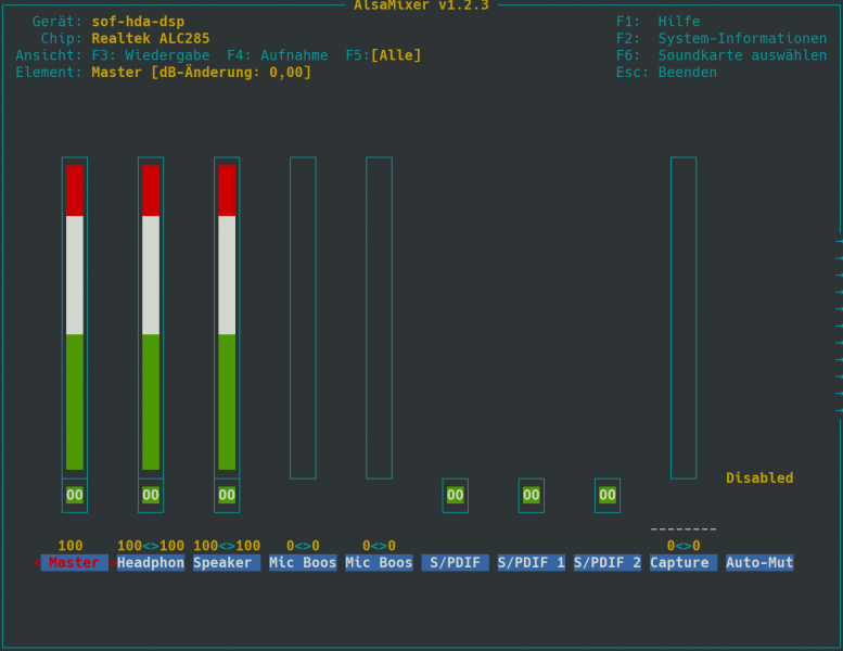sof-hda-dspauswählen - Die Taste "m" drücken um die Stummschaltung des Systems zu deaktivieren.